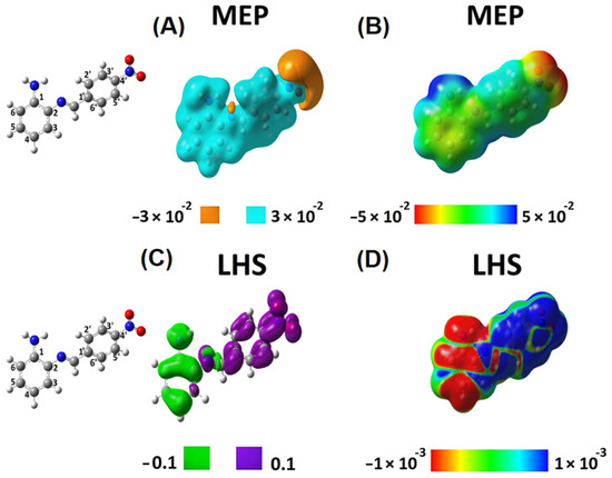 Local reactivity descriptors of SB-1. Molecular electrostatic potential (MEP) and local hyper softness (LHS) values as 3D pictures. Isovalues of MEP are displayed at ±0.03 (or ±0.03 a.u.) (A), and isovalues of LHS are displayed at ±0.1 (or ±0.1 a.u.) for LHS (C). Values of MEP and LHS projected onto at an electron density isosurface of 0.001 ranging from −0.05 to 0.05 (B) and from −0.001 to 0.001 (D) are depicted, respectively. The corresponding atom numbering is shown on the left.