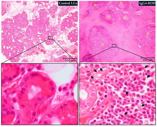 Representative images of hematoxylin and eosin (H&E) staining of the LGs obtained from patients with IgG4-ROD and patients diagnosed with severe canalicular obstruction yet normal LGs as a control. Glandular structure was maintained in the normal control LGs, while completely destroyed in the LGs of the IgG4-ROD patients. Yellow asterisks indicate the area of lymphocytic hyperplasia. Black arrows indicate plasma cells.