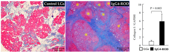 Representative images of Azan Mallory staining and collagen-I expressions of the LGs obtained from the patients with IgG4-ROD and from the patients diagnosed with severe canalicular obstruction yet with no IgG4-ROD. In the LGs of the normal control subjects, the lobes were surrounded by light-blue fibrotic interstitial tissue, while a dark-blue staining in the lymphocytic hyperplasia focus surrounding tissues was observed in the LGs from the patients with IgG4-ROD. Yellow asterisks indicate the area of lymphocytic hyperplasia. Bar graphs show the gene expressions of collagen-I in the LGs of the two groups.