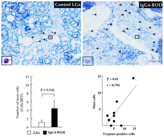 Representative images of toluidine blue staining and MCs population of the LGs obtained from the patients with IgG4-ROD and from the control patients diagnosed with severe canalicular obstruction yet with no IgG4-ROD. Black arrows indicate MCs. Bar graph shows the quantitation of the MCs numbers between the two groups. Line graph shows the linear regression analysis between the numbers of MCs and tryptase-positive cells in all data of the examined LGs.