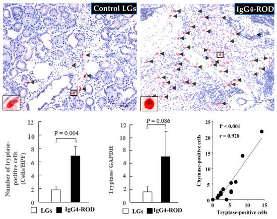 Representative images of tryptase immunostaining, the tryptase-positive cell population, and the tryptase expression of the LGs obtained from the patients with IgG4-ROD and from the control patients diagnosed with severe canalicular obstruction yet with no IgG4-ROD. Bar graphs show the quantitation of the tryptase-positive cell numbers and the tryptase expression between the two groups. Line graph shows the linear regression analysis between the numbers of tryptase-positive cells and chymase-positive cells in all data of the examined LGs. Black arrows indicate the tryptase-positive cells.