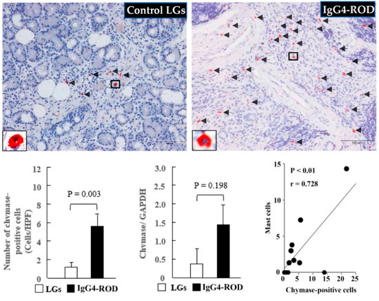 As can be seen in Figure 5, only a few chymase-positive cells were observed in the control LGs (Figure 5, black arrows). However, a marked accumulation of chymase-positive cells was observed in the LGs of the IgG4-ROD patients (Figure 5, black arrows), and that increase was statistically significant in comparison to the increase in the control LGs (Figure 5, bar graph). Moreover, the gene expression of chymase tended to increase in the LGs of the IgG4-ROD patients. It should be noted that in the present study, linear regression analysis was also performed to investigate the relationships among the numbers of MCs, tryptase-positive cells, and chymase-positive cells. As indicated in the line graph in Figure 4, a significant positive correlation was observed between the number of tryptase-positive cells and chymase-positive cells. Correlation analysis also showed a significant positive correlation between MCs and chymase-positive cells (line graph in Figure 5), indicating that the majority of mast cells contain both tryptase and chymase in the LGs obtained from both control and the IgG4-ROD patients.