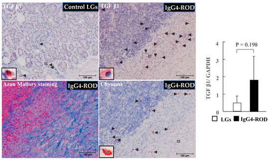 Representative images of transforming growth factor beta-1 (TGF-β1) immunostaining of the normal control LGs, and representative images of TGF-β1 and chymase immunostaining, as well as Azan Mallory staining, performed on serial sections of the LGs obtained from the IgG4-ROD patients. Black arrows indicate the TGF-β1-positive cells or the chymase-positive cells. Bar graphs show the gene expression of TGF-β1 in the LGs in two groups.