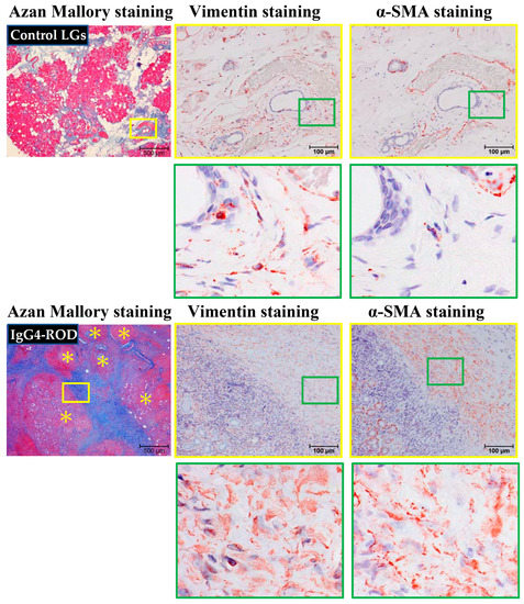 Representative images of vimentin and α-SMA immunostaining performed on serial sections of LGs obtained from patients with IgG4-ROD and from control patients diagnosed with severe canalicular obstruction, but with no IgG4-ROD. These loci were matched with the yellow frames of Azan Mallory-stained sections, shown in the left column. The images of green frames in the bottoms are indicating the enlargement of loci surrounded by green squares. Yellow asterisks indicate the area of lymphocytic hyperplasia.