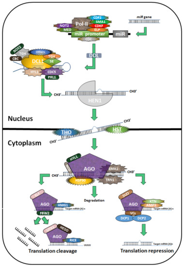 Biogenesis of miRNAs in plants. The diagram depicts miRNA biogenesis in plants. Pol II first transcribes miR genes into pri-miRNAs, leading to the formation of a hairpin structure. The process is regulated by cycling DOF transcription factors (CDF2), SMALL1 (SMA1), cyclin-dependent protein kinase (CDKF), extension gene (ELP), a protein containing the MYB domain (CDC), Mediator2 (MED2), and NOT2. During nuclear splicing and processing, the cap-binding protein complex (CBC including CBP20 and CBP80HYL1), PRL1 (an evolutionarily conserved WD-40 protein), DDL, TGH, and SERRATE (SE) paly regulatory roles. Dicer-Like 1 (DCL1) progressively processes pri-miRNAs and pre-miRNAs to produce one or more phased miRNA/miRNA* duplexes, which are methylated by HUA enhancer 1 (HEN1) and delivered to the cytoplasm by HST1 (HASTY). The miRNA is chosen and integrated into a specific argonaute1 (AGO1)-containing RISC (RNA-induced silencing complex), which guides translation inhibition or cleavage of the target mRNA transcript.