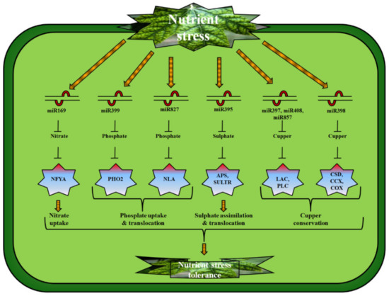 Plant growth and development are regulated by miRNAs [14]. Plants use miRNAs to respond to a variety of biotic and abiotic stressors, such as nutritional stress [18]. Plant miRNAs have been shown to be sensitive to a wide range of nutritional stressors, including nitrogen, phosphorus, potassium, sulfur, copper, iron, boron, magnesium, manganese, zinc, and calcium deficiencies and fluctuations (Table 1). miRNAs that are responsive to nutrient stress and their corresponding targets are summarized in this review. Moreover, miRNAs are described briefly in the context of their regulatory role in modulating the responses of plants to nutrient stress.