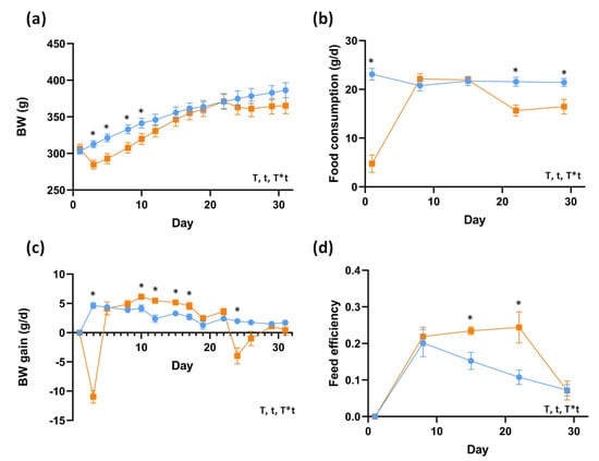 | Final BW (g) | 386.33 ± 10.28 | 365.29 ± 10.85 | 0.17 | 0.95 | |
