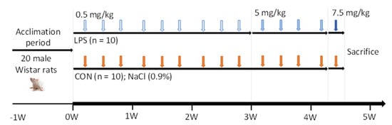 - Ranneh, Y.; Akim, A.M.; Hamid, H.A.; Khazaai, H.; Mokhtarrudin, N.; Fadel, A.; Albujja, M.H.K. Induction of Chronic Subclinical Systemic Inflammation in Sprague-Dawley Rats Stimulated by Intermittent Bolus Injection of Lipopolysaccharide. Arch. Immunol. Ther. Exp. 2019, 67, 385–400. [Google Scholar] [CrossRef] [PubMed]