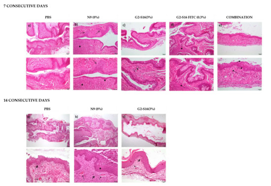 The presence of histological lesions in the vaginal epithelium after G2-S16 vaginal application was studied after 7 days (BALB/c mice) or 14 days of treatment (BALB/c and CD1 mice). The treatment was performed as previously described. Histological damage was described as injury in the vaginal epithelium, inflammatory infiltrate, vascular congestion and/or oedema in the submucosa. The assigned values were added up and determined the level of vaginal irritation as minimal 1–4, average 5–8, moderate 9–11 and severe 12–16 [