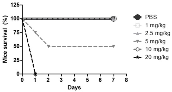 To this end, CD1 mice were divided in six groups, treated intravenously for seven consecutive days with PBS or different doses of G2-S16 dendrimer (1, 2.5, 5, 10, and 20 mg/kg). The CD1 mice survival after treatment was noted (