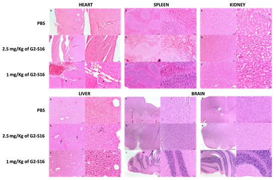 In order to determine the systemic effects of high blood concentrations of G2-S16 dendrimer, brain, heart, kidney, liver, and spleen were studied in CD1 mice after 14 days of daily intravenous treatment with G2-S16 dendrimer (1 and 2.5 mg/kg) PBS as negative control.