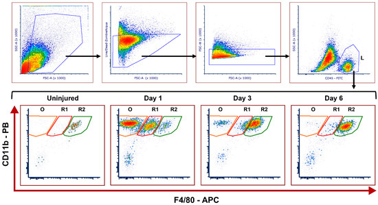 Using a model of corneal epithelial and anterior stroma scraping, Sahu et al. investigated the kinetics of inflammatory cell recruitment over the initial 12 h after injury [28]. They found that the frequency of mast cells progressively increased over the initial 6 h, before declining to baseline at 12 h after injury, while neutrophil infiltration of the cornea progressively increased during the 12 h follow-up after injury. In our study, we focused on later time points and on the kinetics of the mononuclear phagocytes, but we did notice the presence of a population of other immune cells (CD45+CD11b+ F4/80−) that includes neutrophils, that was not present in the uninjured corneas but was elevated at days 1 and 3 after injury. These findings complement the observations reported by Sahu et al. and may suggest that the frequency of neutrophils remains elevated for at least 3 days but not until day 6 post-corneal injury (Figure 2). Neutrophils are involved in the early phase of the immune response and can be mediators of collateral tissue damage [29].