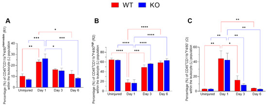 There was also a significant difference over time in the O subset (two-way ANOVA, p-value < 0.0001; WT uninjured vs. D1 adjusted p-value = 0.0012; KO uninjured vs. D1 adjusted p-value = 0.0019; Figure 2C).