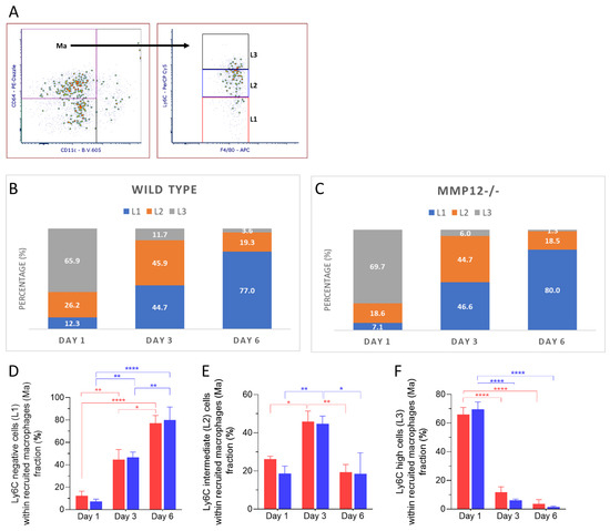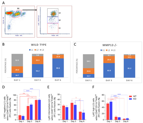 Expression of Ly6C revealed three distinct populations within the R1 subset: Ly6Cneg (L1), Ly6Cint (L2), and Ly6Chigh (L3) (Figure 3A). The relative proportions of these populations showed dynamic changes following injury (Figure 3B,C). On day 1 post-injury, the Ly6Chigh (L3; proinflammatory) subset was predominant, comprising 52.5% in corneas from WT mice and 58.5% in corneas from Mmp12−/− mice. On days 3 and 6 post-injury, the Ly6Cneg (L1) subset was predominant with 56.2% for WT and 62% for Mmp12−/− at day 3 post-injury and 80.6% for WT and 81.2% for Mmp12−/− at day 6 post-injury. The percentage of Ly6Cneg (L1) cells was significantly increased (p < 0.0001) at days 3 and 6 post-injury compared with day 1 in corneas from WT (18.7% versus 56.2% and 80.6%, respectively) and Mmp12−/− (15.7% versus 62% and 81.2%, respectively) mice (Figure 3D). By contrast, the percentage of Ly6Chigh (L3) cells was significantly reduced (p < 0.0001) at days 3 and 6 post-injury compared with day 1 in corneas from WT (52.5% versus 9.8% and 3.4%, respectively) and Mmp12−/− (58.5% versus 8.1% and 4.6%, respectively) mice (Figure 3F). The percentage of Ly6Cint(L2) cells also changed over time (p = 0.0032), showing a significant reduction between days 3 and 6 post-injury in corneas from WT (33.5% versus 15.9%) and Mmp12−/− (29.4% versus 14.1%) mice. These results show a shift in Ly6C expression by MP cells following injury with the Ly-6Chigh (proinflammatory) subset being expressed early and the Ly6Cneg being expressed later at the time points of maximal mononuclear phagocyte recruitment.