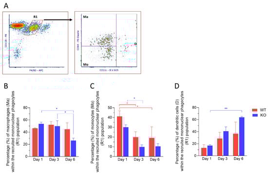 The frequency of F4/80intCD11c− CD64− recruited monocytes within each group showed a significant reduction from 1 day post-injury to 3 days post-injury in corneas from both WT (41.16% versus 19.82%; p = 0.00312) and Mmp12−/− mice (30.04% versus 9.84%; p = 0.0429). No difference was observed when comparing WT vs. Mmp12−/− on days 1, 3 or 6 (p = 0.3872; p = 0.4777; p = 0.6882, respectively) (Figure 4C).