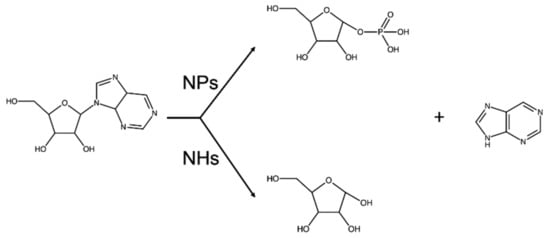 N-ribosidic bond cleavage in biological systems. Phosphorolysis catalyzed by NPs or hydrolysis by NHs of ribosides (here, purine riboside is shown as a general example) releases the nitrogenous base, and either ribose 1-phosphate or ribose is formed.