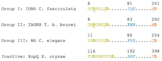 NH fingerprint sequence in NH enzymes and NH-like proteins. In bold are the Asp residues that are involved in the coordination of the Ca2+ ion. Underlined are the amino acid residues in each group that have been demonstrated through site-directed mutagenesis to be involved in catalysis. The color scheme matches the one used in the active site representations. The sequences are taken from the deposited PDB files (PDB codes 2MAS, 4I71, 5MJ7, 4P5F).