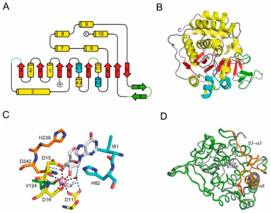 In all group I NHs, the enzyme active site is in a cavity at the C-terminal end of strands β1 and β4, with contributions from several loop regions and residues from helices α8 and α9. The bottom of the cavity is characterized by three Asp residues, two part of a conserved DxDxxxDD fingerprint sequence in the β1-α1 region and one from approximately 230 amino acids downstream (Figure 2). These negatively charged residues coordinate a Ca2+ ion, the octacoordination of which is completed in the unliganded NHs by the carbonyl oxygen of a Thr/Ile residue and three ordered water molecules. Binding of nucleoside substrates or transition state-like inhibitors leads to the displacement of two water molecules by the O2’ and O3’ ribosyl hydroxyls (Figure 3). The remaining water molecule is poised for the nucleophilic attack in the hydrolytic reaction from the opposite side of the β-N-glycosidic bond, yielding α-ribose as the reaction product that undergoes mutarotation on release from the enzyme. Both the α and β anomers of ribose can bind to the NHs active sites, as seen in the E. coli RihA structure. Other ligands such as glycerol, a common cryoprotectant in X-ray cryocrystallography experiments, can mimic part of the ribosyl moiety and are typically observed in NH active sites [].