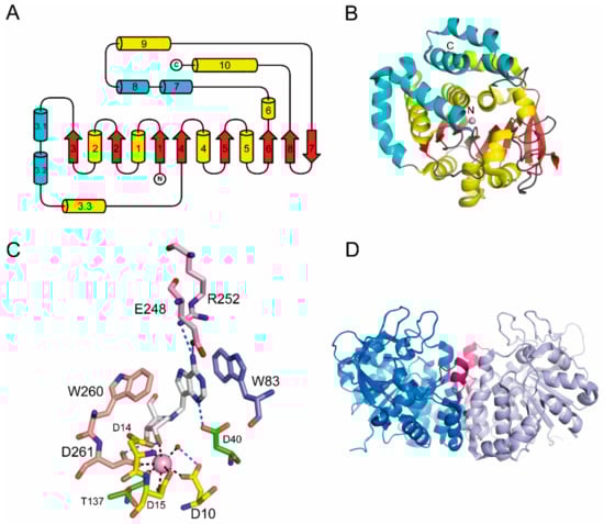 The first NH crystal structure determined was of the inosine-uridine-preferring, but substantially non-specific, isozyme from the trypanosomatid parasite C. fasciculata []. Highly similar structures have since been identified in bacterial, archaeal, and plant NHs with either pyrimidine nucleoside specificity or a broad tolerance for both purine and pyrimidines in the aglycone (Table S2). The polypeptide folds into a single domain, composed of a central eight-stranded mixed β-sheet surrounded by α-helices. The first six β-strands are parallel to each other, each one followed by one α-helix to constitute a series of right-handed β-α-β motifs that closely resemble the Rossmann fold. The third α-helix is part of an extended “crossover” junction segment, leading to strand β4 that is parallel to β1 and to the topological switch point that hosts the substrate binding site. After strand β6, the polypeptide folds into three separate α-helices that stack toward one side of the core β-sheet, and together with the C-terminal α10 helix, complete the enzyme active site. Two additional β-strands, one parallel and one antiparallel, complete the central β-sheet. The polypeptide arrangement also includes two additional short β-strands, antiparallel to each other and not interacting with the core structure (Figure 3).