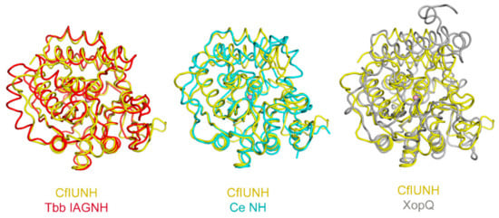 Structural comparison between NH proteins. Pairwise superposition of the T. brucei brucei IAG-NH (red), C. elegans NH (cyan), and X. oryzae XopQ onto the C. fasciculata IU-NH (yellow) highlights the conservation of the core b-sheet, while the surrounding secondary structural elements assume diverse orientations, affecting their activity and oligomerization.