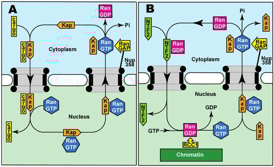 For nuclear import (Figure 2A), β-karyopherins bind their cargoes in the cytoplasm (frequently using an adapter protein such as importin-α in the case of importin-β) and, after diffusing through nuclear pores [,,], this complex is dissociated by RanGTP binding to the β-karyopherin, a process that may be accelerated by specific nucleoporins such as Nup1 and Nup2 located at the cytoplasmic face of the nuclear pore [,]. The β-karyopherin:RanGTP complex then returns to the cytoplasm where the GTPase activity of Ran is stimulated by its activating protein (RanGAP) generating RanGDP that then dissociates from the β-karyopherin, freeing it for another round of nuclear import. The RanGDP so generated is then recycled to the nucleus by NTF2, where the Ran guanine nucleotide exchange protein, RCC1, recharges it with GTP (Figure 2B). Conversely, the principal nuclear protein export carrier CRM1 complexed with RanGTP binds its cargo in the nucleus and subsequently releases the cargo in the cytoplasm following GTP hydrolysis stimulated by RanGAP []. Cargoes are generally recognized by the appropriate carrier through specific sequence motifs, such as the classic nuclear protein import nuclear localization sequences [,,,]. Also, increasing the number of these signal sequences increases the rate of transport of larger cargoes [,]. The nuclear export of most mRNAs instead employs the NXF1:NXT1 heterodimer as a carrier and here the binding and unbinding of cargo are orchestrated by altering the RNA structure using ATP-powered DEAD-box helicases in the nucleus and cytoplasm [,]. In addition to nuclear pores facilitating their export to the cytoplasm, the nuclear basket of the pores functions as a scaffold for several components of the mRNA maturation machinery, most notably in yeast [,,,].