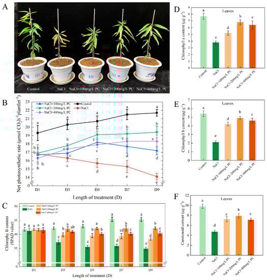 We found that 200 mg/L PC had a better alleviation effect on NaCl concentration of 70 mmol/L, so NaCl + 200 mg/L PC was selected as one of the treatments. The possible reason is that 200 mg/L PC is the optimum concentration for peach seedlings to resist 70 mmol/L NaCl. As can be observed in Figure 1A, the salt stress treatment not only hindered the development of the peach plants, but also caused leaf yellowing and negatively affected the photosynthetic system of the plant. Our research found that the net photosynthetic rate value in the control treatment increased slightly over time. Compared with the control treatment, the net photosynthetic rate value of the NaCl treatment gradually decreased. The treatments of NaCl + 100 mg/L PC, NaCl + 200 mg/L PC, and NaCl + 400 mg/L PC showed that the net photosynthetic rate was always lower than the control treatment and higher than the NaCl treatment. The net photosynthetic rate in the salt treatments supplemented with 200 mg/L PC and 400 mg/L PC slowly increased from the first to the fifth day and then stabilized from the fifth to the ninth day. The treatment with NaCl + 200 mg/L PC alleviated more significantly the adverse influence of salt stress. Among them, the treatment with NaCl + 200 mg/L PC alleviated more significantly the adverse influence of salt stress. From the third to the ninth day, the net photosynthetic rate of the NaCl + 200 mg/L PC treatment increased by 9.0%, 19.5%, 21.7%, and 22.9% compared with the NaCl treatment (Figure 1B). As can be seen in Figure 1C, salt stress had a greater impact on the chlorophyll content of peach leaves. Salt stress exposure prolongation gradually decreased the chlorophyll content in the leaves. Compared with NaCl treatment, adding PC can significantly reduce the decrease in chlorophyll content. We measured chlorophyll a, chlorophyll b and carotenoids on the ninth day of salt stress, and found that the treatment of NaCl + 200 mg/L PC had higher values than the other treatments. Chlorophyll a, chlorophyll b and carotenoids of the NaCl + 200 mg/L PC treatment increased by 78.9%, 133.3%, and 68.1% compared with the NaCl treatment (Figure 1D–F).