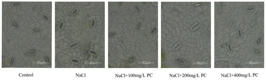 Our observation under 400x magnification showed that the stomata of the peach leaves in the control treatment were open and the shape of the stomata guard cells was round and full. The NaCl treatment resulted in guard cell closure. On the contrary, the shape of the stomata treated with three salt stress supplemented with PC is relatively full, but there are also stomata in the closed state (Figure 2). Of them, the stomata treated with 200 mg/L PC was in the open state, indicating that the gas normally interacted with the outside environment. The data of the length, width, and area of the stomata are presented in Table 1. As can be seen, the average area of the stomata in the salt treatments was smaller than the untreated control, whereas the area of the stomata in the treatments with PC supplementation was larger. The largest guard cell area was established in the PC-supplemented treatment with 200 mg/L. Compared with the NaCl treatment, the NaCl + 200 mg/L PC treatment had 28.3% larger guard cell width and 37.4% greater area.