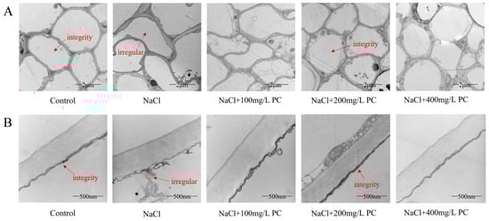 Transmission electron micrograph of peach tree root cells and cell membranes. (A) Root cell integrity. Bars correspond to 2 μm; (B) Root cell membrane integrity. Bars correspond to 500 nm. The red arrows in the NaCl-treated figures represent irregular cells and cell membrane structures. The red arrows in the control and NaCl + 200 mg/L PC-treated figures indicate intact cells and cell membrane structures. Measurements were performed using the root tips of peach plants. The data were sampled at 11:00 a.m. on the 11th day after the salt stress treatment.