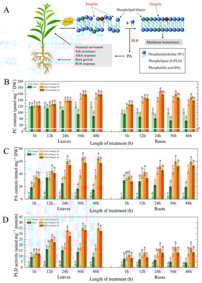 We found that under salt stress, the leaves and roots of peach seedlings could absorb exogenous PC (Figure 5B), and the activity of PLD in the cell was significantly enhanced (Figure 5D). Of the examined treatment, NaCl + 200 mg/L PC had the most pronounced impact on the PLD activity in the leaves and roots. PLD decomposes PC, producing PA. As can be seen in Figure 5C, the content of PA, which is a secondary messenger, was significantly increased. PA plays also an important role in the tolerance of plants to salt stress.