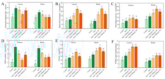 As can be seen in Figure 7C, compared with 100 mg/L PC and 400 mg/L PC, exogenous application of 200 mg/L PC had the most significant increase in POD activity in leaves and roots. The POD activity of the leaves in that treatment was 47.47% higher than that of the NaCl treatment; the POD activity of the roots was 66.05% higher than that of the NaCl treatment. Its effect is beneficial as H2O2 is released in the cell, which reduces the damage to plants by POD. The high amount of MAD in plants indicates a severe degree of plant cell membrane damage as it is a manifestation of the degree of peroxidation. As can be observed in Figure 7D, the content of MDA in the salt stress treatment was higher than that in the control group, indicating that salt stress had increased the degree of peroxidation in the leaf and root cell membranes. However, the addition of PC significantly reduced the peroxidation degree of the plant cell membrane. In the NaCl + 200 mg/L PC treatment, the MDA contents in the leaves was 64.53% lower, respectively, than those in the NaCl treatment. The 200 mg/L PC and 400 mg/L PC treatments could significantly reduce MDA content in roots, which were 48.41% and 46.29% lower than NaCl treatments, respectively.