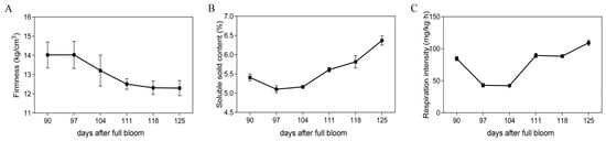 Physiological indexes investigation. (A) Firmness values of fresh fruit flesh at six preharvest stages. (B) Soluble solid contents of fresh fruit flesh at six preharvest stages. (C) Respiration intensities of fresh fruit flesh at six preharvest stages. At least three readings were used to plot one point. The data represent the error bars ± SE (Standard Error) of three biological replicates.