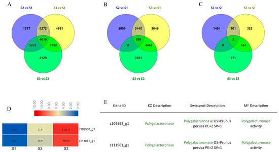 The Venn diagrams of differentially expressed genes (DEGs) and the expression levels of transcripts. (A) Venn diagrams of all DEGs among three comparisons including S2 vs. S1, S3 vs. S1, and S3 vs. S2. (B) Venn diagrams of upregulated DEGs among three comparisons including S2 vs. S1, S3 vs. S1, and S3 vs. S2. (C) Venn diagrams of upregulated DEGs with a 5-fold change among three comparisons including S2 vs. S1, S3 vs. S1, and S3 vs. S2. (D) Expression levels of two key transcripts including c109562_g1 and c111961_g1. (E) Annotations of c109562_g1 and c111961_g1. The green font indicates c109562_g1 and c111961_g1 were both annotated as polygalacturonase in three known online databases including KO, Swissprot, and MF.