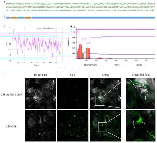 Protein structure analysis and subcellular localization of AaPG18. (A) Deduced protein sequence of AaPG18 with 395 amino acids. (B) Schematic representation of AaPG18 protein structure. Two possible N-terminus transmembrane domains (orange boxes) were included. (C) Hydropathic profile of AaPG18 protein using the predicting tool ProtScale (https://web.expasy.org/protscale/, accessed on 25 November 2021). (D) Prediction of transmembrane structure using TMHMM-2.0 (http://www.cbs.dtu.dk/services/TMHMM/, accessed on 25 November 2021). (E) Subcellular localization of AaPG18 in Nicotiana benthamiana (N. benthamiana) leaves. Cells expressing AaPG18–GFP fusion gene exhibited GFP fluorescence signals which were distributed in the cytoplasmic membrane. Cells expressing an empty vector only with a GFP tag showed GFP fluorescence signals at the nucleus and membrane. Three observed fields including brightness, GFP, and mergence were captured. The magnified field showed GFP signals in different parts of cells. White and orange arrows indicate the presence of GFP signals in the cell membrane and nucleus, respectively.