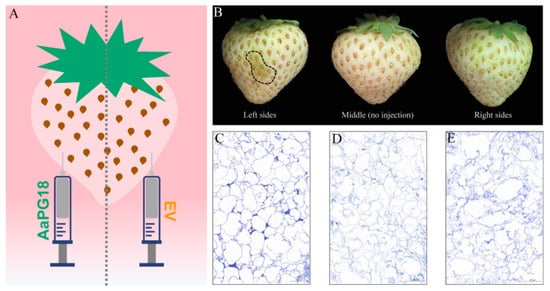 Transient overexpression in fruits of strawberry “snow”. (A) Diagrammatic sketch of the transient injection on the left and right sides of the same fruit of strawberry. (B) Phenotype observation of strawberry three days after injection. (C) Morphological observation of the cell section of strawberry fruit infiltrated with pBI121–AaPG18. (D) Morphological observation of the cell section of strawberry fruit without any injection. (E) Morphological observation of the cell section of strawberry fruit infiltrated with pBI121 (empty vector) as the control. The scale bar: 200 μm.