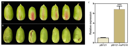 The homologous transformation is considered among the best ways to investigate gene function. To understand the roles of AaPG18 in kiwifruit, the transient overexpression was conducted in A. arguta “RB-4” by using the signal fruit control method. The fruit side injected with pBI121–AaPG18 turned red (Figure 6A), while nothing appeared on the side infiltrated with the empty vector (Figure 6B). The appearance of red color in “RB-4” overexpressing AaPG18 indicated its involvement in fruit maturity. Therefore, these obvious phenotypic results confirmed the key role of AaPG18 in fruit ripening and softening. The qPCR resulted showed a significantly higher expression level of AaPG18 on the fruit side infiltrated with pBI121–AaPG18 than on the opposite side infiltrated with pBI121 (Figure 6C).