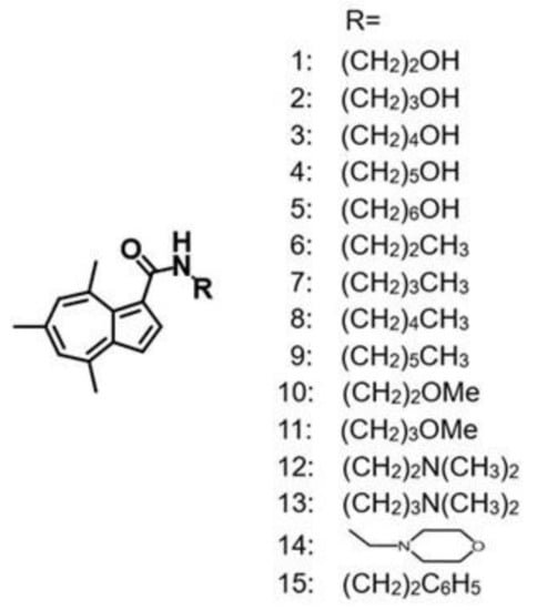 - Wada, T.; Maruyama, R.; Irie, Y.; Hashimoto, M.; Wakabayashi, H.; Okudaira, N.; Uesawa, Y.; Kagaya, H.; Sakagami, H. In Vitro Anti-tumor Activity of Azulene Amide Derivatives. In Vivo 2018, 32, 479–486. [Google Scholar] [CrossRef] [Green Version]