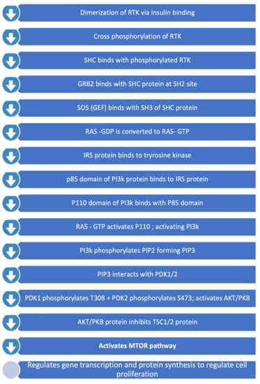 PIK3/Akt/mTOR Signalling Pathway is involved in various cellular processes including proliferation, growth, cytoskeletal rearrangement and apoptosis []. This pathway, summarised in Figure 1, involves RTKs (such as EGFR) and tumour suppressor protein PTEN (Phosphatase and Tensin Homolog Deleted from Chromosome 10). PTEN is a lipid phosphatase and leads to downregulation of the RTK/PI3K/Akt pathway via antagonizing PI3K function []. Protein kinase B (Akt) and mammalian target of rapamycin (mTOR) are serine/threonine-specific protein kinases (STKs) that play key roles in cellular proliferation (Figure 1) []. RTK/PI3K/Akt signalling is altered in 80% of human GBMs. Homozygous deletion or mutations of PTEN leading to constitutive activation of this pathway were associated with 40% of GBMs []. Mutations and amplifications in the PIK3CA, coding for p110 subunit, have been associated in 5% and 13% of primary GBMs, respectively [].