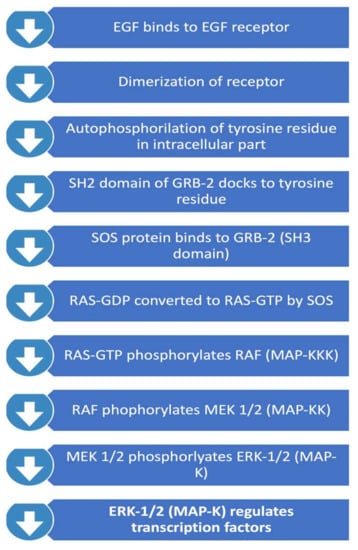 This pathway, summarised in Figure 2, is important in regulating cell proliferation, differentiation, and survival. Activated RAS protein recruits the RAF family of serine/theorinine kinase (STKs) such as ARAF, BRAF and CRAF1. Activated RAF subsequently activates mitogen-activated protein kinase kinase called MEK. Active MEK phosphorylates mitogen-activated protein kinase (MAPK). MAPK subsequently translocates into the nucleus and leads to activation of important transcription factors that promote cell proliferation. Important transcription factors activated through this pathway include c-myc, STAT (signal transducers and activators of transcriptome) and PPARγ (peroxisome proliferator-activated receptor γ) which are involved in inducing cell cycle progression and anti-apoptosis genes []. Interestingly, RAS mutations themselves are rare in GBMs, and therefore focus has been on the upstream regulators of the pathway. RAS activation is regulated by neurofibromin 1 (NF-1), a tumour suppressor gene. NF-1 has been identified to play a role in tumorigenesis in gliomas. 18% of GBMs contain NF-1 mutation/homozygous deletion, whereas this number is higher in mesenchymal GBMs (37%) [].