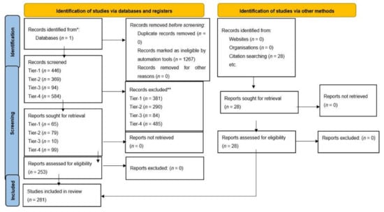 - Page, M.J.; McKenzie, J.E.; Bossuyt, P.M.; Boutron, I.; Hoffmann, T.C.; Mulrow, C.D.; Shamseer, L.; Tetzlaff, J.M.; Akl, E.A.; Brennan, S.E.; et al. The PRISMA 2020 statement: An updated guideline for reporting systematic reviews. BMJ 2021, 372, n71. [Google Scholar] [CrossRef] [PubMed]