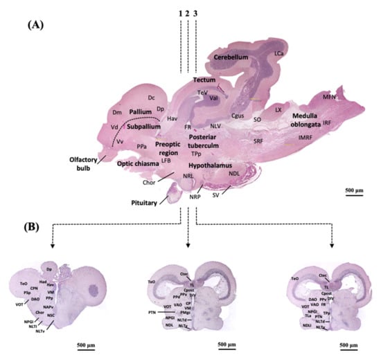 Neuroanatomy section (A) the whole brain of the orange-spotted grouper showing different areas of the olfactory bulb, telencephalon, diencephalon, mesencephalon, rhombencephalon and (B) showing three chosen areas of the brain for the in situ hybridization correspond to the series Sections 1, 2, and 3 where most enriched expression zone for the genes star, sf-1, and dax-1. Dashed lines showed the dissection position of transverse section. Hematoxylin and eosin were used to stain brain sections. aNH, anterior neurohypophysis; Chor, commissura horizontalis; Cgus, commissure of the secondary gustatory nuclei; CPN, central pretectal nucleus; Ctec, commissural tecti; Cpost, posterior commis-sure; DAO, dorsal accessory optic nucleus; Dc, central zone of dorsal telencephalic area; DiV, diencephalic ventricle; Dm, medial zone of dorsal telencephalic area; Dp, posterior zone of dorsal telencephalic area; FR, fasiculus retroflexus; Hav, ventral habenular nucleus; IMRF, intermediate reticular hypothalamus; IRF, inferior reticular formation; LCa, lobus caudalis cerebella; LFB, lateral forbrain bundle; LX, vagal lobe; MFN, medial funicular nucleus; NDL, diffuse nucleus of the inferior lobe; NLV, nucleus lateralis nucleus; NPGl, lateral preglomerular nucleus; NRL, nucleus of the lateral recess; NRP, nucleus of the posterior recess; NLTd, lateral tuberal nucleus, dorsal part; NLTv, lateral tuberal nucleus, ventral part; PI, pars intermedia; PMgc, gigantocellular part of the magnocellular preoptic nucleus; pNH, posterior neurohypophysis; PPa, parvocellular preoptic nucleus, anterior part; PPd, proximal pars distalis; PPv, periventricular pretectal nucleus, ventral part; PSp, parvocellularsuperficialpretectalnucleus; PTN, posteriortuberalnu-cleus; SO, secondary octaval population; SRF, superior reticular formation; SV, saccus vasculosus; TeV, tectal ventricle; TeO, tectum opticum; TL, torus longitudinalis; TPp, periventricular nucleus of the posterior tuberculum; Val, lateral division of the valvula cerebella; VM, ventromedial thalamic nucleus; VMH, ventromedial hypothalamus.