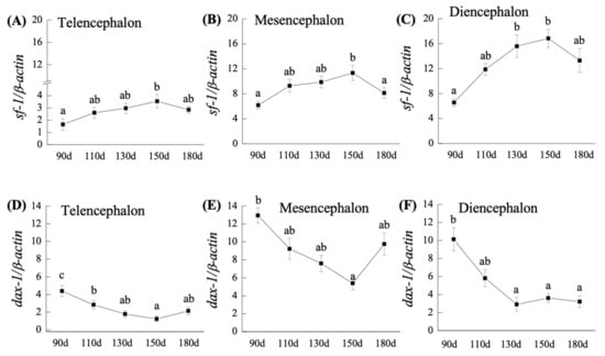 Relative transcripts of sf-1 (A–C) and dax-1 (D–F) in the telencephalon, mesencephalon, and diencephalon from 90- to 180-dah (days after hatching) during gonadal sex differentiation. Gene expression levels were measured by q-PCR and expressed as mean normalized expression (SEM) of n = 8 fish for each group. Different letters denote statistically significant differences (p < 0.05) in gene expression at various developmental ages.