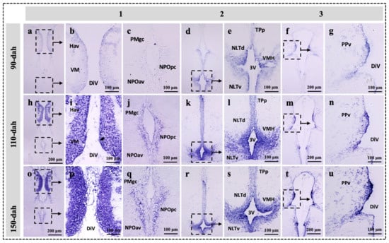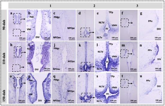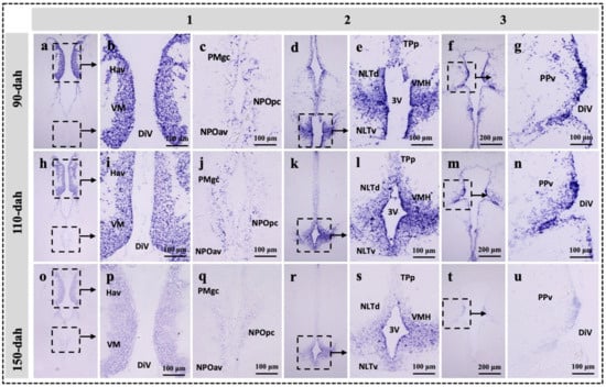 Three hypothalamic brain areas were selected for the in situ hybridization analysis corresponding to the series Sections 1, 2, and 3, the most enriched expression zone for the genes star, sf-1, and dax-1 (Figure 1). The developmental mRNA distribution pattern of star, sf-1, and dax-1 in the hypothalamic areas of the grouper brain was demonstrated at 90-, 110-, and 150-dah (Figure 3, Figure 4 and Figure 5). star, sf-1, and dax-1 transcripts were found in the ventral habenular nucleus, ventromedial thalamic nucleus, diencephalic ventricle, anteroventral part of the parvocellular preoptic nucleus, gigantocellular part of the magnocellular preoptic nucleus, and lateral tuberal nucleus, dorsal and lateral parts of the hypothalamic nucleus (Figure 3a–u and Figure 5a–u). Localization of star (at 110-dah) (Figure 3h–n) and sf-1 (at 110- and 150-dah) (Figure 4h–u) transcriptional signals were primarily found in cells of the ventral zone of the periventricular hypothalamus. However, dax-1 transcripts were higher at 90-dah (Figure 5a–g) compared to 110-dah (Figure 5h–n) and 150-dah (Figure 5o–u) in the ventral zone of the periventricular hypothalamus (Figure 5o–u). Parallel brain sections hybridized with the sense probes revealed no positive mRNA signals (Figure S4).