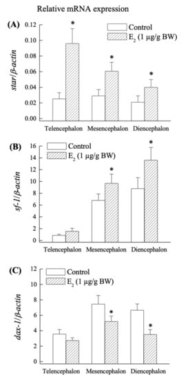 Furthermore, the current study highlights the in vivo effect of exogenous E2 on the regulation of star, sf-1, and dax-1 in the grouper early brain. E2 is the most biologically prominent and active member of the estrogen family of steroids, and it has a wide range of effects on the developing brain []. According to a recent study, the peak expression of numerous neurosteroidogenic genes in the brain of black porgy at the time of gonadal differentiation is mediated by both E2-independent and E2-dependent pathways []. E2 exposure was found to up-regulate star mRNA in the brain and gonad of the self-fertilizing fish, Kryptolebias marmoratus []. On the other hand, the xenoestrogen, diethylstilbestrol exposure decreased in the total amount of sf-1 mRNA in the unborn rat testis but not in fetal ovaries []. Holt (1989) [] proposed the possibility of E2, stimulating the transport of cholesterol to the inner mitochondrial membrane. This is consistent with our findings, which reveal that E2 exposure increases the expression of sf-1 and star mRNA.