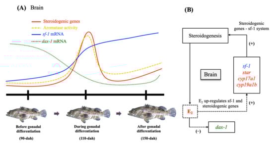 sf-1 is an obvious candidate gene to explain the developmental expression pattern in neural estrogen synthesis in the early female brain, as it regulates the transcription of various target genes involved in steroidogenesis. The expression profiles of star, sf-1, and dax-1 are correlated to the time at which most of the other key steroidogenic genes (cyp11a1, hsd3b1, cyp17a1, and cyp19a1b) and estrogen receptors (erα, erβ1, erβ2, and gpr30) exhibited maximal expression in the early female grouper brain [,]. In contrast to this scenario, lower expression of dax-1 was found in the early brain during gonadal sex differentiation when sf-1 and other key steroidogenic enzymes (including Cyp19a1b activity) were high, indicating that the grouper brain has a functional peak of neurosteroidogenis that may be regulated by sf-1 and dax-1 (Figure 7). As a result, at 110-dah, decreased expression of dax-1 and increased expression of sf-1, as well as significantly increased expression of other key steroidogenic genes, may suggest that these orphan nuclear receptor genes play an important role in brain steroidogenesis during the early developmental period.