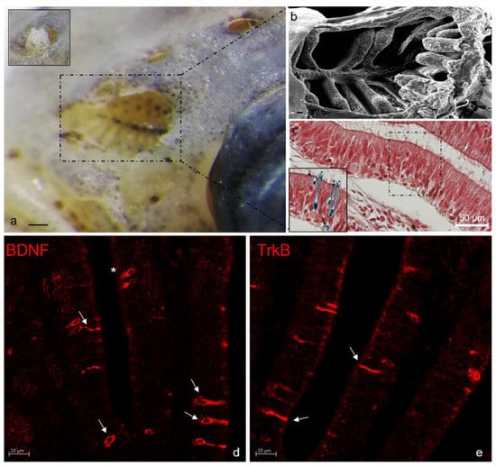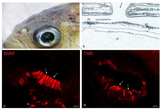 - Germana, A.; Catania, S.; Cavallaro, M.; González-Martínez, T.; Ciriaco, E.; Hannestad, J.; Vega, J. Immunohistochemical localization of BDNF-, TrkB-and TrkA-like proteins in the teleost lateral line system. J. Anat. 2002, 200, 477–485. [Google Scholar] [CrossRef] [PubMed]