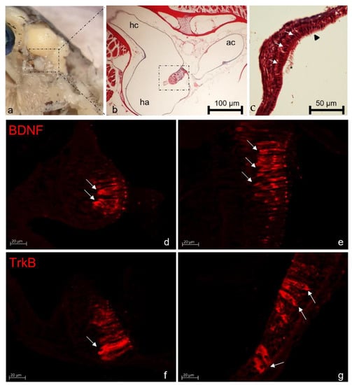 - Germanà, A.; Guerrera, M.C.; Laurà, R.; Levanti, M.; Aragona, M.; Mhalhel, K.; Germanà, G.; Montalbano, G.; Abbate, F. Expression and Localization of BDNF/TrkB System in the Zebrafish Inner Ear. Int. J. Mol. Sci. 2020, 21, 5787. [Google Scholar] [CrossRef] [PubMed]