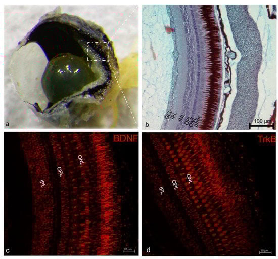 - Cellerino, A.; Kohler, K. Brain-derived neurotrophic factor/neurotrophin-4 receptor TrkB is localized on ganglion cells and dopaminergic amacrine cells in the vertebrate retina. J. Comp. Neurol. 1997, 386, 149–160. [Google Scholar] [CrossRef]