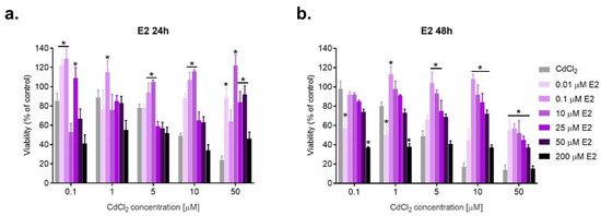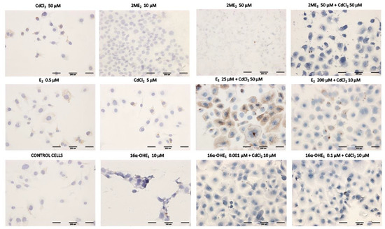Based on the results obtained and the literature data for the estrogen–cadmium interaction studies, the following concentrations were selected: for E2—0.01, 0.1, 10, 25, 50, and 200 μM; for 2-MeOE2 and for 16α-OHE1—1 nM, 0.1, 10 and 50 μM. Moreover, the following doses were chosen for CdCl2: 0.1, 1, 5, 10 and 50 μM. (Figure 2, Figure 3 and Figure 4).