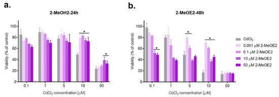 Changes in SKOV-3 viability after the simultaneous effect of both 2-MeOE2 and CdCl2 measured by MTT after 24 h and 48 h against CdCl2 alone (* statistically significant, p < 0.05).