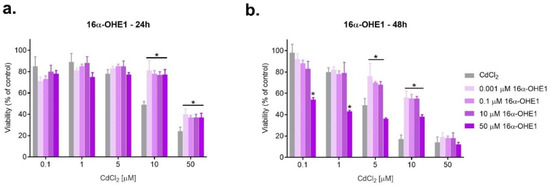 Changes in SKOV-3 viability after simultaneous effect of both 16α-OHE1 and CdCl2 measured by MTT after 24 h and 48 h against CdCl2 alone (* statistically significant, p < 0.05).